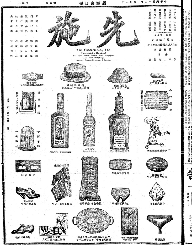 Facebook Page《搜舊報紙》搬家 29/02/2429/02/24 ~ ycteo 當年刊登整版廣告的通常是香煙公司。 先施是香港第一間華資百貨公司。廣告中可知當時先施公司在廣東、上海、倫敦都有分店。 圖中可見先施牌品的洗髮水、香水、髮油。 商品中最貴的是手錶,從五元五角到四百零五元都有。 只有牙刷有自己的廣告文案:一毛不拔。 圖中有貨品“小童雪車”,狀似踏板車的東西。我還以為踏板車的近代之物。為何叫雪車呢? 新國民報 1923年01月31日 廣告 先施公司 pskl0013 分享此文: 按一下以分享至 Facebook(在新視窗中開啟) Facebook 按一下即可分享至 X(在新視窗中開啟) X 喜歡 正在載入... 相關 頁面: 1 2 3 4 5 6 7 8 9 10 11 12 13 14 15 16 17 18 19 20 21 22 發表者:ycteo 檢視 ycteo 的所有文章