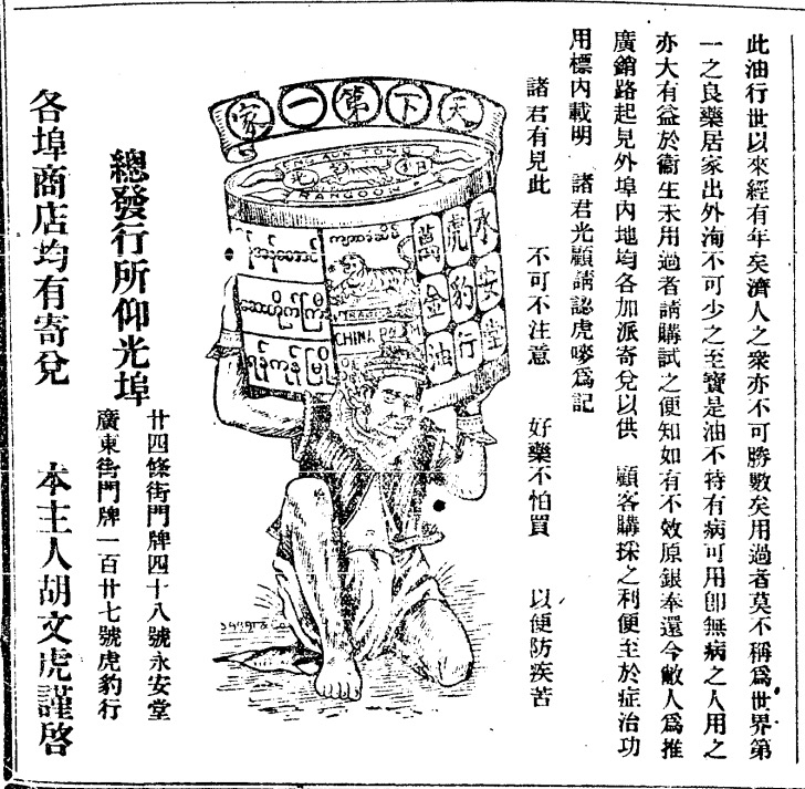Facebook Page《搜舊報紙》搬家 29/02/2429/02/24 ~ ycteo 包裝文字,可辨讀的有:ENG AUN TONG/仰光/RANGOON/永安堂/虎豹行/萬金油,其他多是緬文。 “天下第一家”的slogan算對吧? 虎標萬金油原創於緬甸。1923年胡文虎才將永安堂遷到新加坡。 舊報紙中各類廣告,最多的就是此類中成藥。 新國民日報 1919年10月03日 虎標萬金油 廣告 pskl0016 分享此文: 按一下以分享至 Facebook(在新視窗中開啟) Facebook 按一下即可分享至 X(在新視窗中開啟) X 喜歡 正在載入... 相關 頁面: 1 2 3 4 5 6 7 8 9 10 11 12 13 14 15 16 17 18 19 20 21 22 發表者:ycteo 檢視 ycteo 的所有文章
