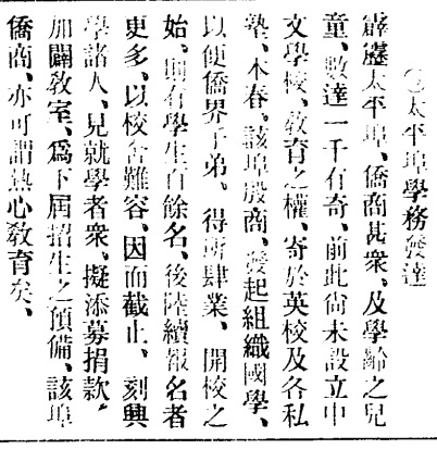 Facebook Page《搜舊報紙》搬家 29/02/2429/02/24 ~ ycteo 文中雖未述及校名,查太平第一所華文學校確為1913年所創立的修齊學校。 修齊於1937年與振華學校(1921年創立)、勵群女校(1926創立)合併為華聯學校。 振南日報 1913年04月01日 太平華聯 pskl0005 分享此文: 按一下以分享至 Facebook(在新視窗中開啟) Facebook 按一下即可分享至 X(在新視窗中開啟) X 喜歡 正在載入... 相關 頁面: 1 2 3 4 5 6 7 8 9 10 11 12 13 14 15 16 17 18 19 20 21 22 發表者:ycteo 檢視 ycteo 的所有文章