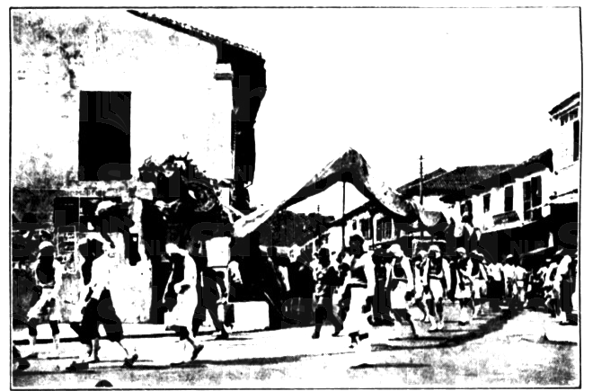 A portion of the long procession in the main road.The progress of the dragonChinese burn crackers around which the carriers of the dragon dance and yell.